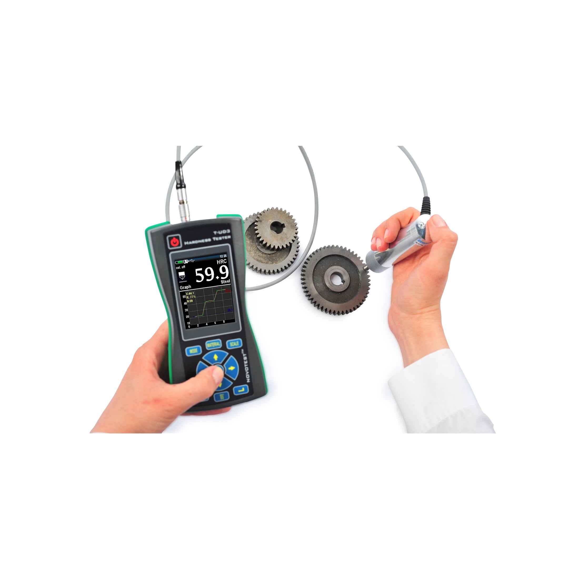 The imprint after measuring the hardness by the UCI method is several microns, and is practically not detected by the naked eye, in comparison with the Leeb method, the imprint of which is about 500 microns in diameter, depending on the hardness. It also makes it possible to measure the hardness of hardened layers of materials (nitriding, cementation, etc.)